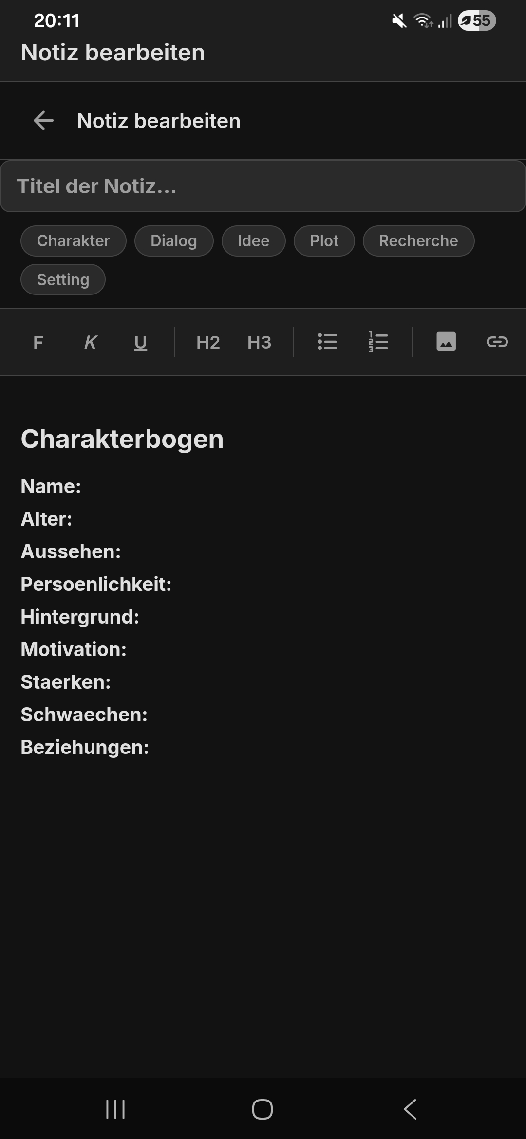 Nutzen sie Vorlagen zu Charakter, Szene oder Plot um Informationen gezieler abzulegen.